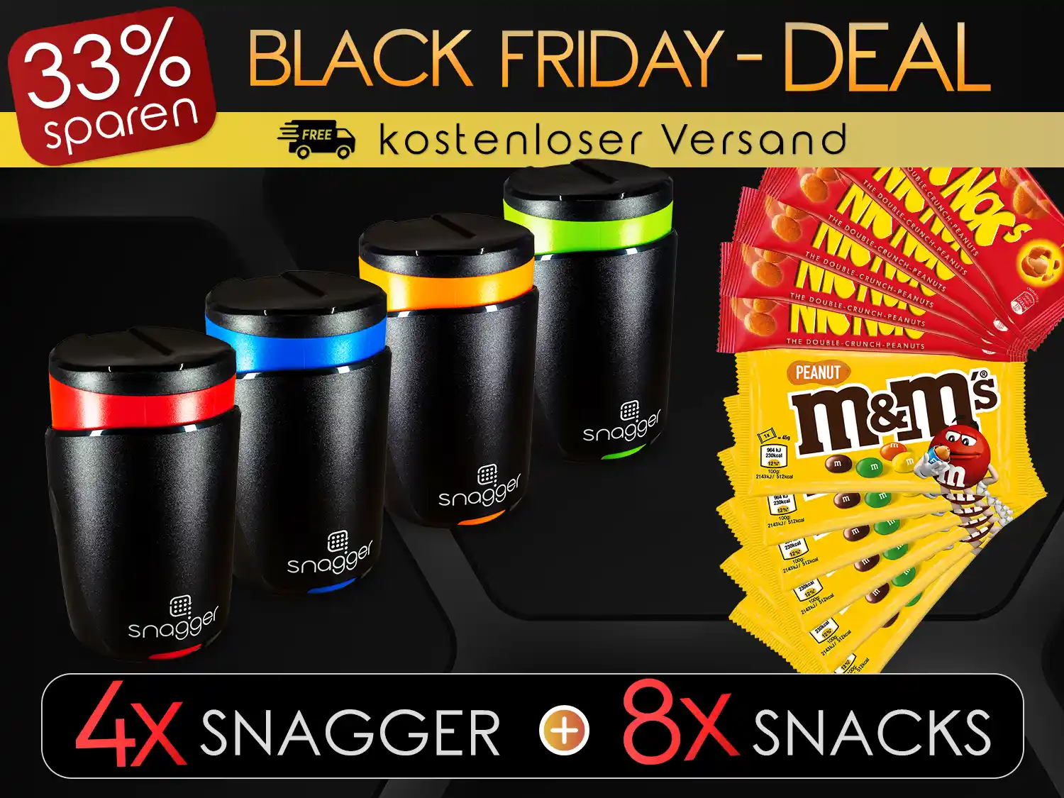 - der SNAGGER ist für eine Vielzahl handelsüblicher Snacks geeignet z.B. Erdnüsse, NicNacs, Studentenfutter, M&Ms, …